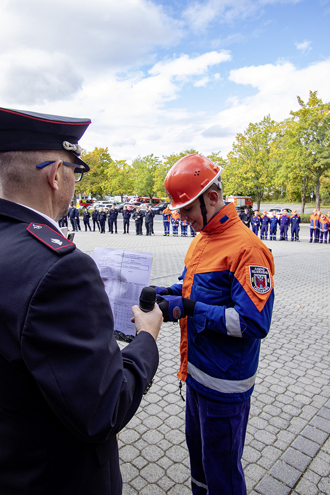 Bei der Verleihung bedankten sich Kreisjugendwartin Pamela Hollerbach, die Abnahmeberechtigen Frank Luckenbach und Mike Supper sowie Kreisbrandmeister Jörg Kirschenlohr und der Ehrenvorsitzende des Kreisfeuerwehrverbandes Neckar-Odenwald-Kreis bei den Jugendlichen für ihr Engagement, bei den Schiedsrichtern sowie der Feuerwehr und Jugendfeuerwehr Buchen für die Vorbereitung und Ausrichtung der Abnahme. Am frühen Nachmittag durften die Jugendlichen aus Elztal (Neckar-Odenwald-Kreis), Karlsruhe, Linkenheim-Hochstetten (Landkreis Karlsruhe Land), Brühl, Eppelheim, Ladenburg, Reilingen (alle Rhein-Neckar-Kreis) sowie Crailsheim (Landkreis Schwäbisch Hall) das begehrte Abzeichen aus den Händen der Abnahmeberechtigten entgegennehmen und es von nun an der Jugendfeuerwehr-Uniform tragen.