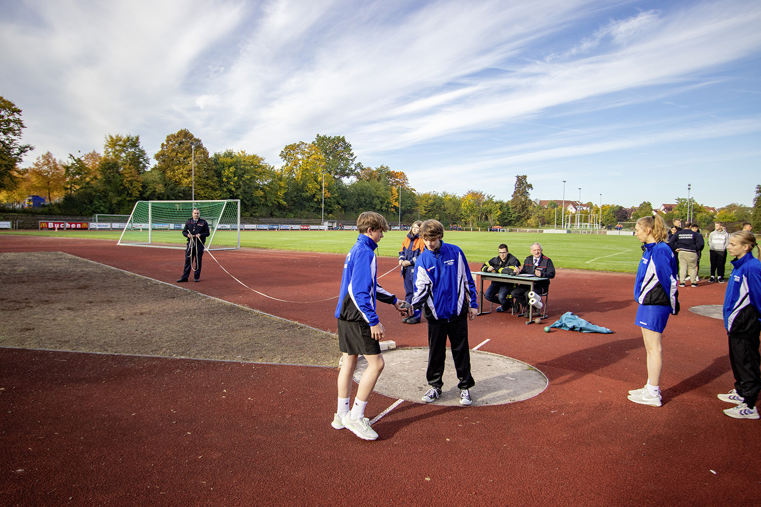 Für die Gruppen galt es gemeinsam fünf Aufgaben zu erfüllen und dabei auch noch einen guten Eindruck bei den Schiedsrichtern zu hinterlassen. Um im Kugelstoßen gemeinsam 55 m zu erreichen mussten sich alle Gruppenmitglieder anstrengen und die 4-kg-Kugel (Jungen) bzw. die 3-kg-Kugel (Mädchen) ohne überzutreten soweit wie möglich über die Wiese befördern. Der zweite sportliche Teil besteht aus einem Staffellauf über 1500 m, bei dem es den Jugendlichen freigestellt ist, wer wie weit läuft. Wichtig ist nur, dass das Staffelholz spätestens nach vier Minuten und zehn Sekunden die Ziellinie passiert hat.