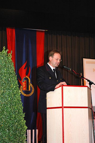 Im Anschluss im die Totenehrung stellte der Kassier der Jugendfeuerwehr Baden-Württemberg, Uwe Seehaus, die Beschlussfähigkeit der Versammlung fest. Landrat Dr. Achim Brötel begrüßte die Teilnehmer zur zweiten Delegiertenversammlung im Neckar-Odenwald-Kreis. Brötel freute sich außerordentlich über die wachsende Zahl der Jugendfeuerwehren im Neckar-Odenwald-Kreis und schrieb diesen Erfolg dem Konto der Kreisjugendfeuerwehr gut.