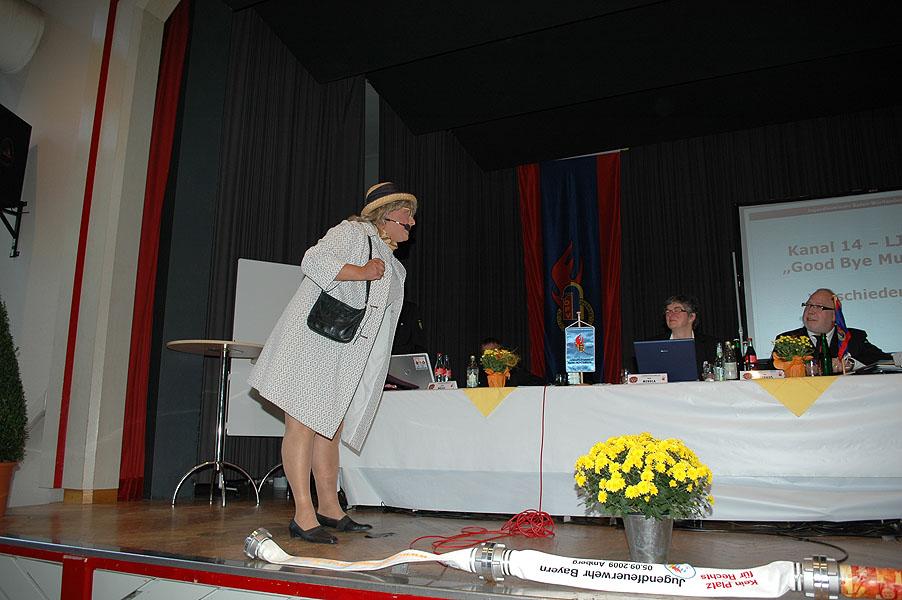 Erna, die rasante Dampfnudel, ein in Mudau aufgewachsener Comedy-Künstler, unterbrach Thomas Häfele, bei seinem ersten Versuch, zum Tagesordnungspunkt "Verschiedenes". Mit ihrer bzw. seiner Mischung aus Witz und Kabarett unterhielt Richard Korger alias Erna die rund 300 Delegierten und rundete die Veranstaltung ab.
