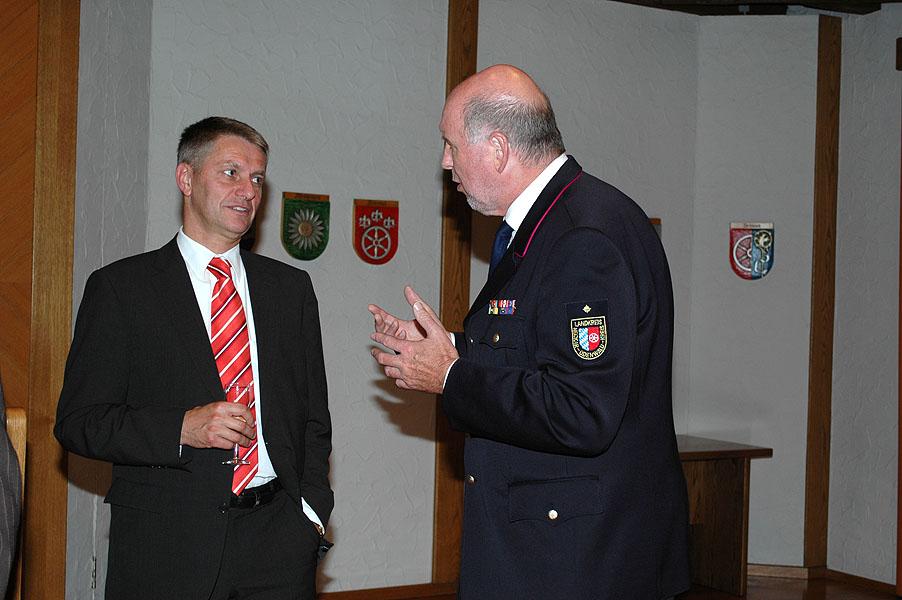 Dr. Nobert Rippberger und Dr. Achim Brötel zeigten sich sehr erfreut, dass diese wichtige Versammlung nach 15 Jahren wieder einmal im Neckar-Odenwald-Kreis stattfinden kann. Beide skizzierten in kurzen aber aussagekräftigen Grußworten ein Bild der Gemeinde Mudau bzw. des Neckar-Odenwald-Kreises und betonten die Wichtigkeit der Einrichtung Feuerwehr für die Allgemeinheit und die Jugendfeuerwehr als Stütze und Nachwuchsorganisation der Feuerwehren. Landrat Brötel überbrachte außerdem die Grüße des ebenfalls anwesenden Kreisbrandmeisters Rainer Dietz und seines Stellvertreters Klaus Theobald.