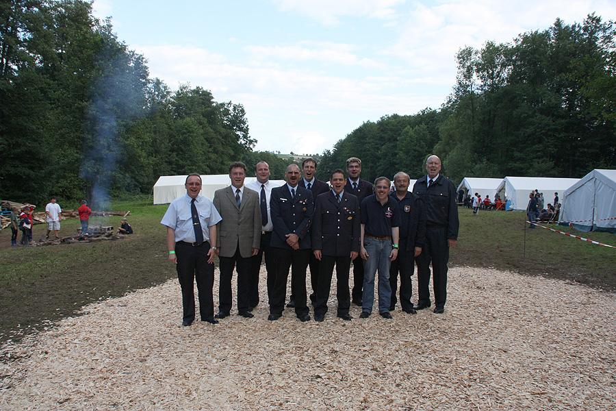 Unter den Gästen, die am Abend den Lagerplatz besuchten, befanden sich unter anderem mehrere Bürgermeister und viele Führungskräfte der Feuerwehren im Neckar-Odenwald und Landrat Dr. Achim Brötel, der betonte, wie wichtig es ihm sein, die Nachwuchsorganisation der Feuerwehren zu besuchen. Brötel lobte die Arbeit der Jugendfeuerwehren im Neckar-Odenwald-Kreis, deren Anzahl der Jugendgruppen - entgegen dem allgemeinen Trend in der Jugendarbeit - langsam aber stetig auf mittlerweile 69 angewachsen ist. Die Zahl der Mädchen in der Jugendfeuerwehr mache ihm große Hoffnungen für die Zukunft der Feuerwehren im Landkreis.