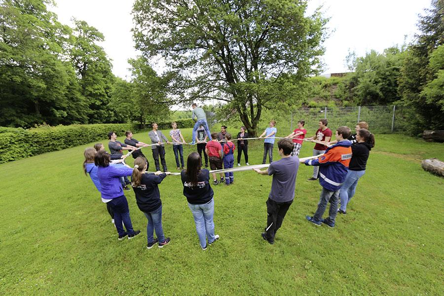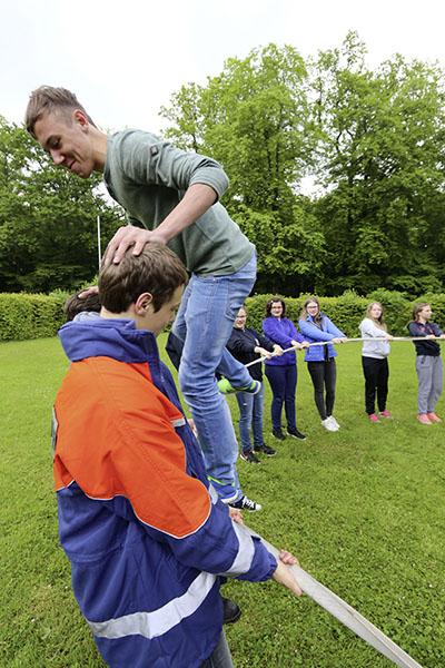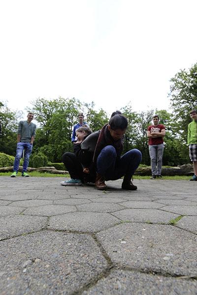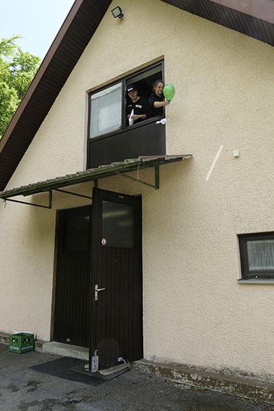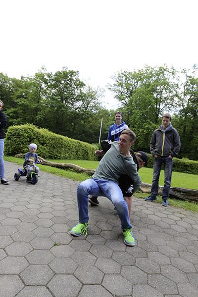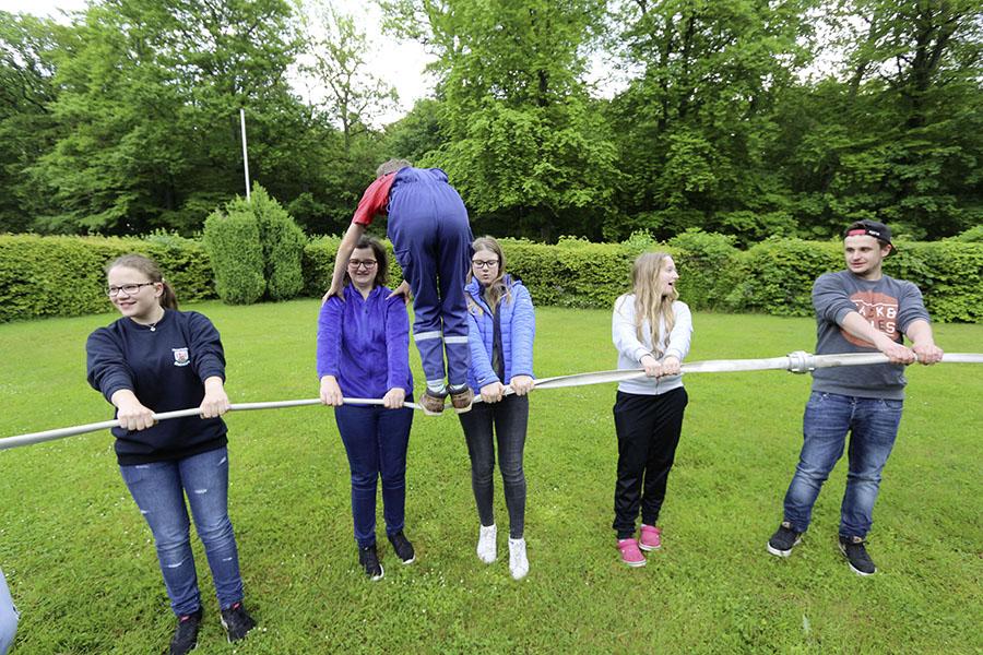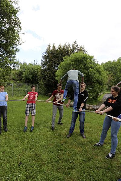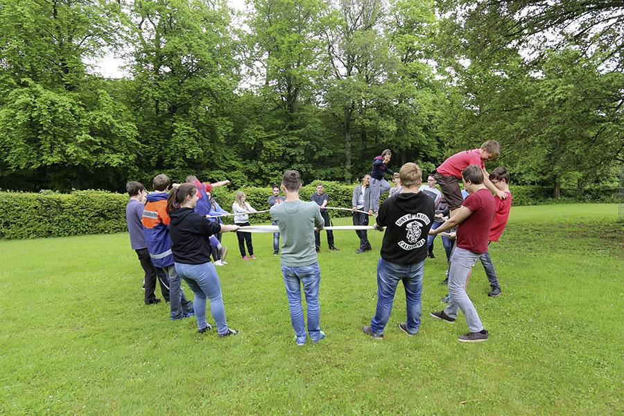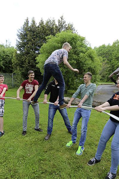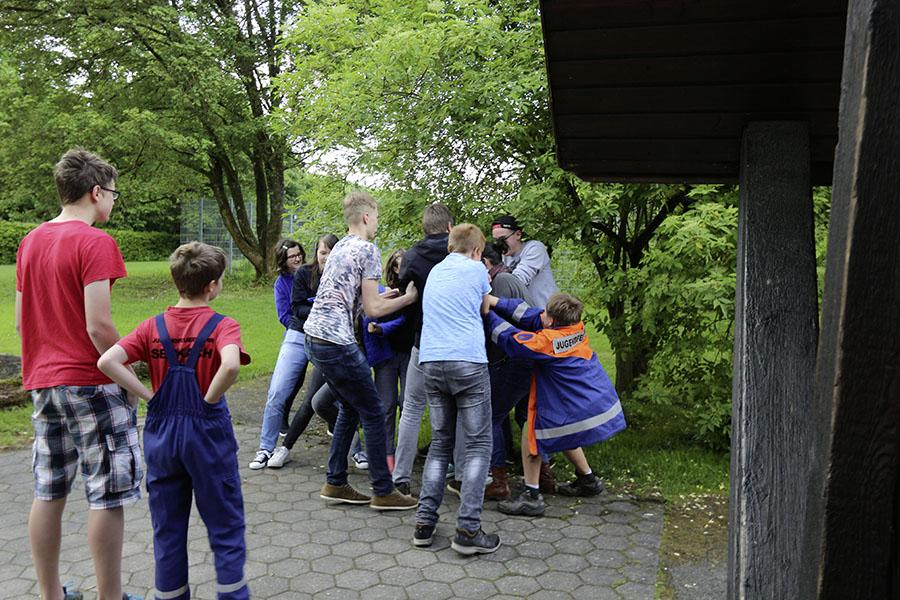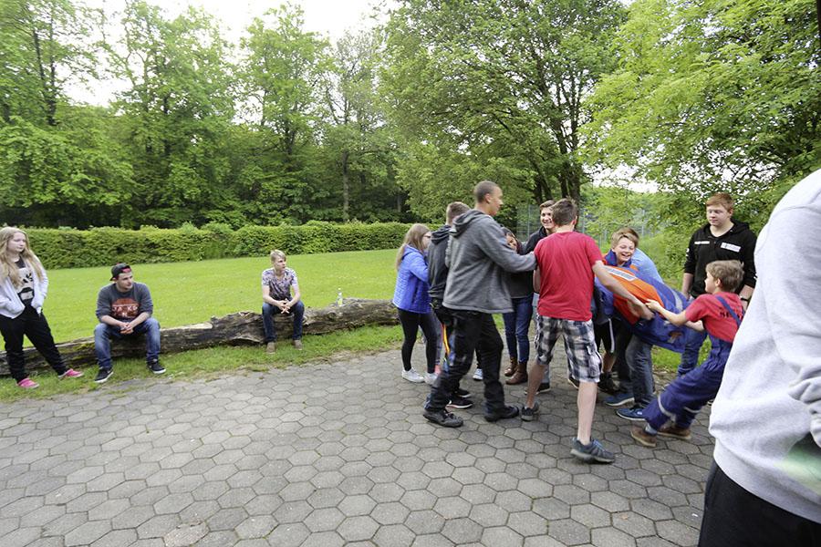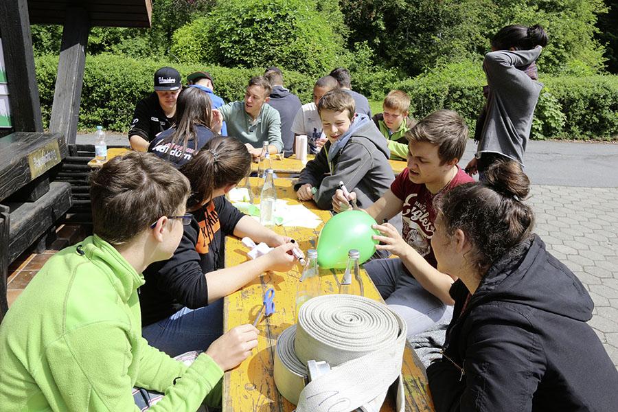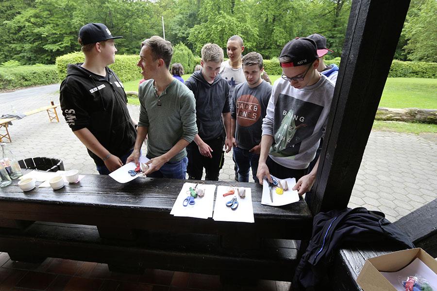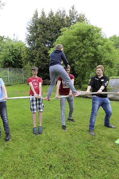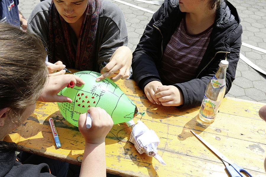 Bei dem abschließenden Spiel "Eggs can fly" galt es, ein Ei mit vorgegebenem Material so zu verpacken, dass es einen Sturz aus vier Meter Höhe überlebt. Bei drei der vier Gruppen klappte dies auch.